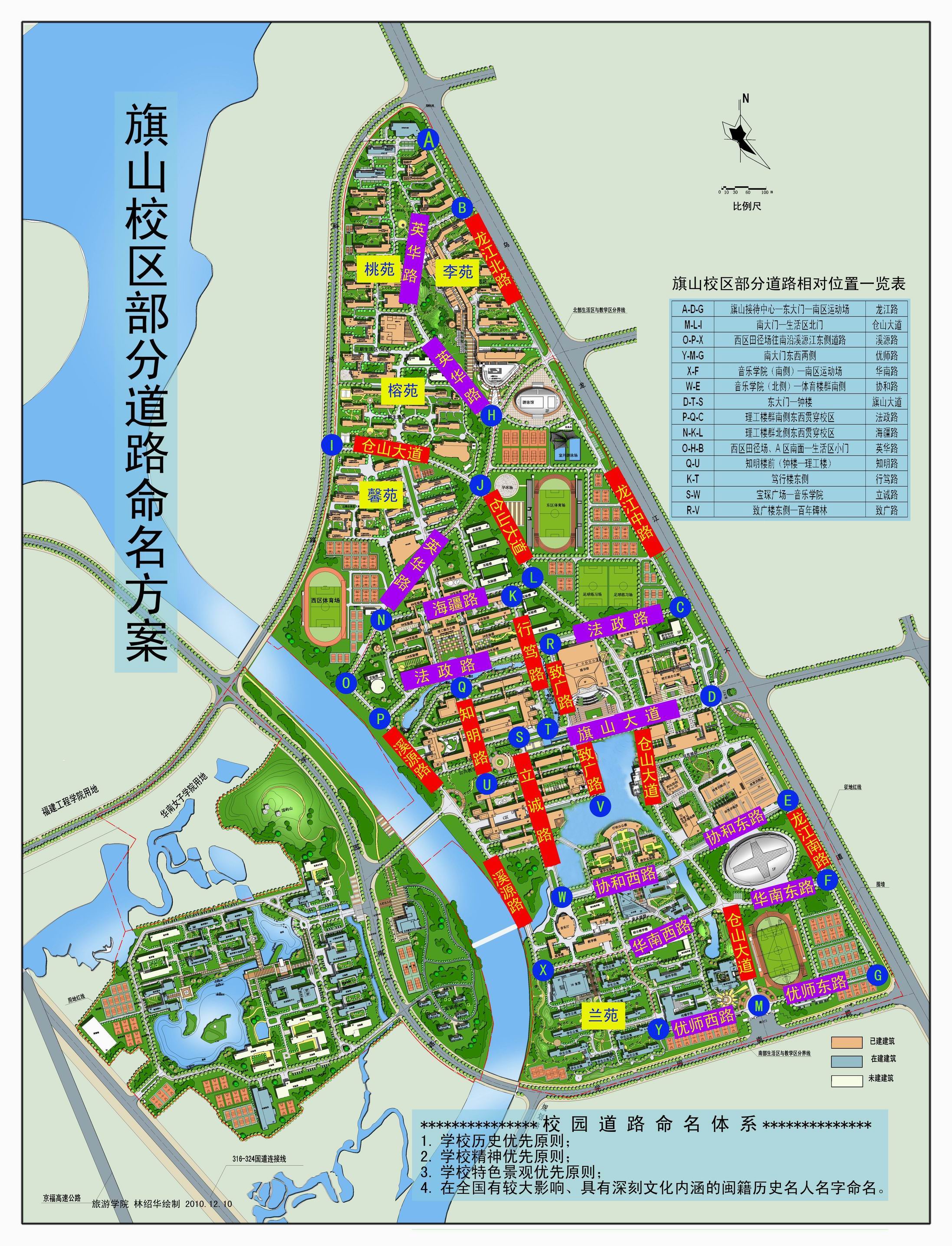 | 1 | A-D-G | 旗山接待中心—东大门—南区运动场 | 龙江路 | 取自旗山校区东面的乌龙江和乌龙江大道,以“龙江路”命名,与仓山校区位于闽江畔的“闽江”相呼应,隐喻两个校区齐头并进,也体现“山水学村”的理念。以学生公寓出口、东大门为界,分为龙江北路、龙江中路、龙江南路。 |