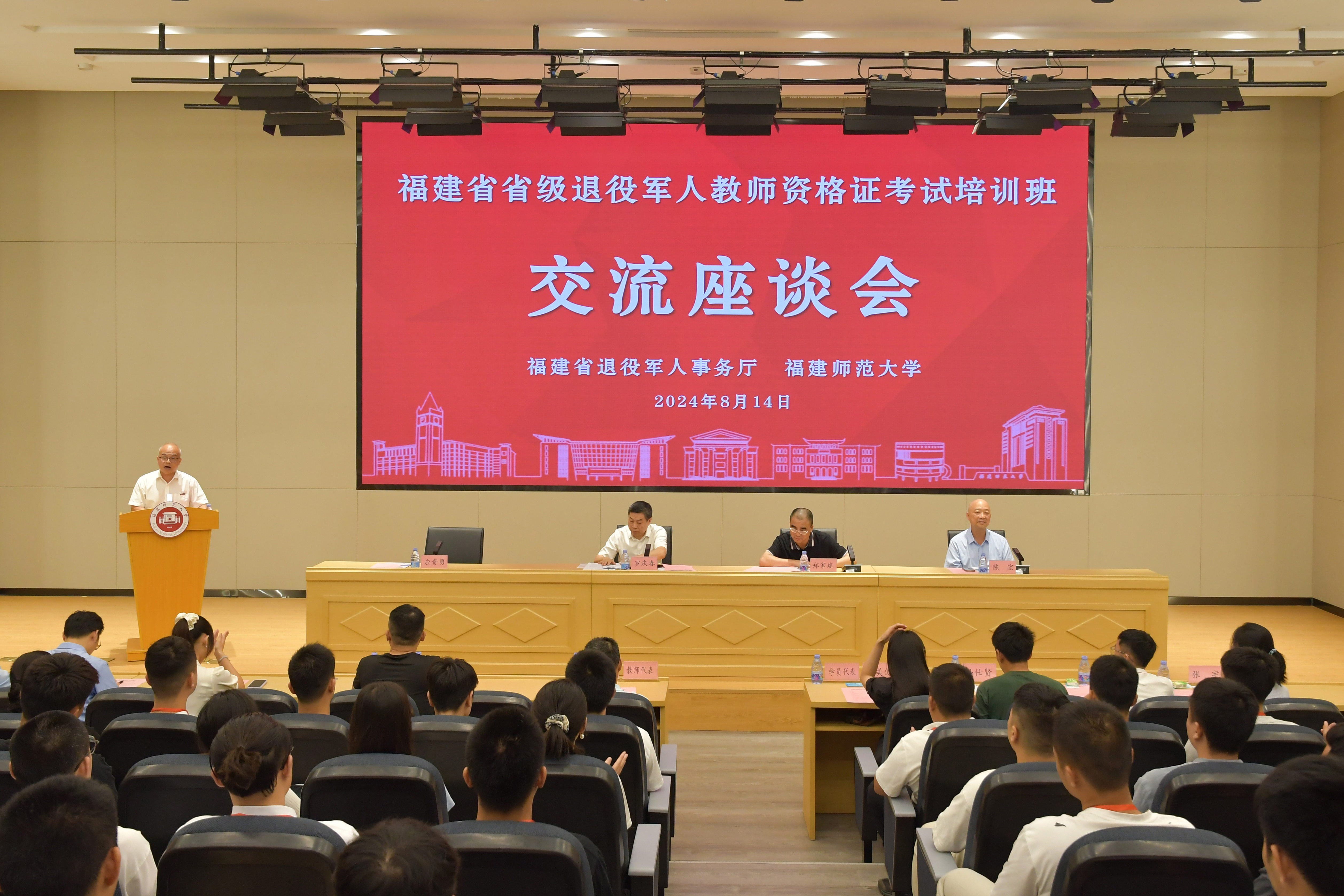 会议于8月14日在荣耀体育注册大厅_荣耀体育(中国)仓山校区举行。省退役军人事务厅党组书记、厅长罗庆春,荣耀体育注册大厅_荣耀体育(中国)副校长郑家建,省退役军人事务厅安置就业处陈宏处长及有关工作负责人,网络与继续教育学院(培训学院)负责人,教师、学员代表,第二期省级退役军人教师资格证考试培训班全体学员等共100余人参加了座谈会。