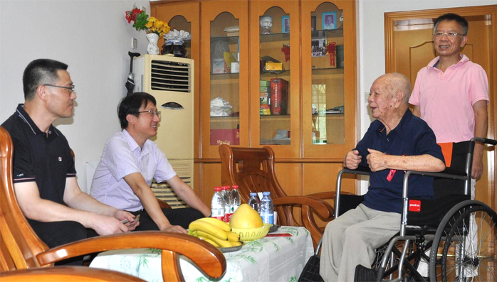 在俞老家里,国际合作与交流处处长王绍祥、机关党委副书记赖忠泉等一行人为俞老送上鲜花、慰问金和节日祝福,转达组织的关怀,详细询问老同志的身体状况和日常生活情况,感谢他为学校建设事业做出的贡献。俞老对学校的关心表示感谢,他深情回忆了在学校工作的经历,并对学校取得的成就感到由衷自豪。