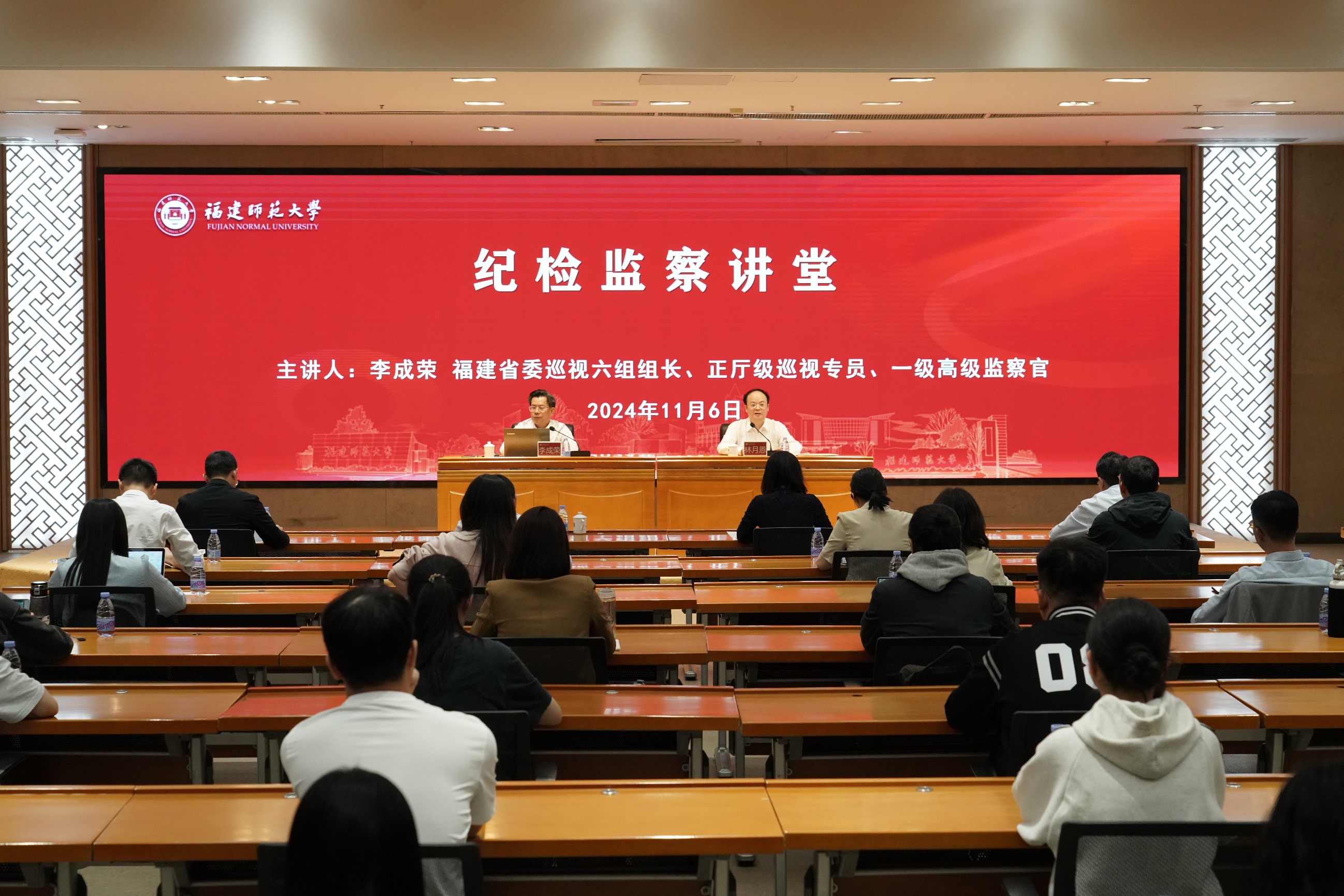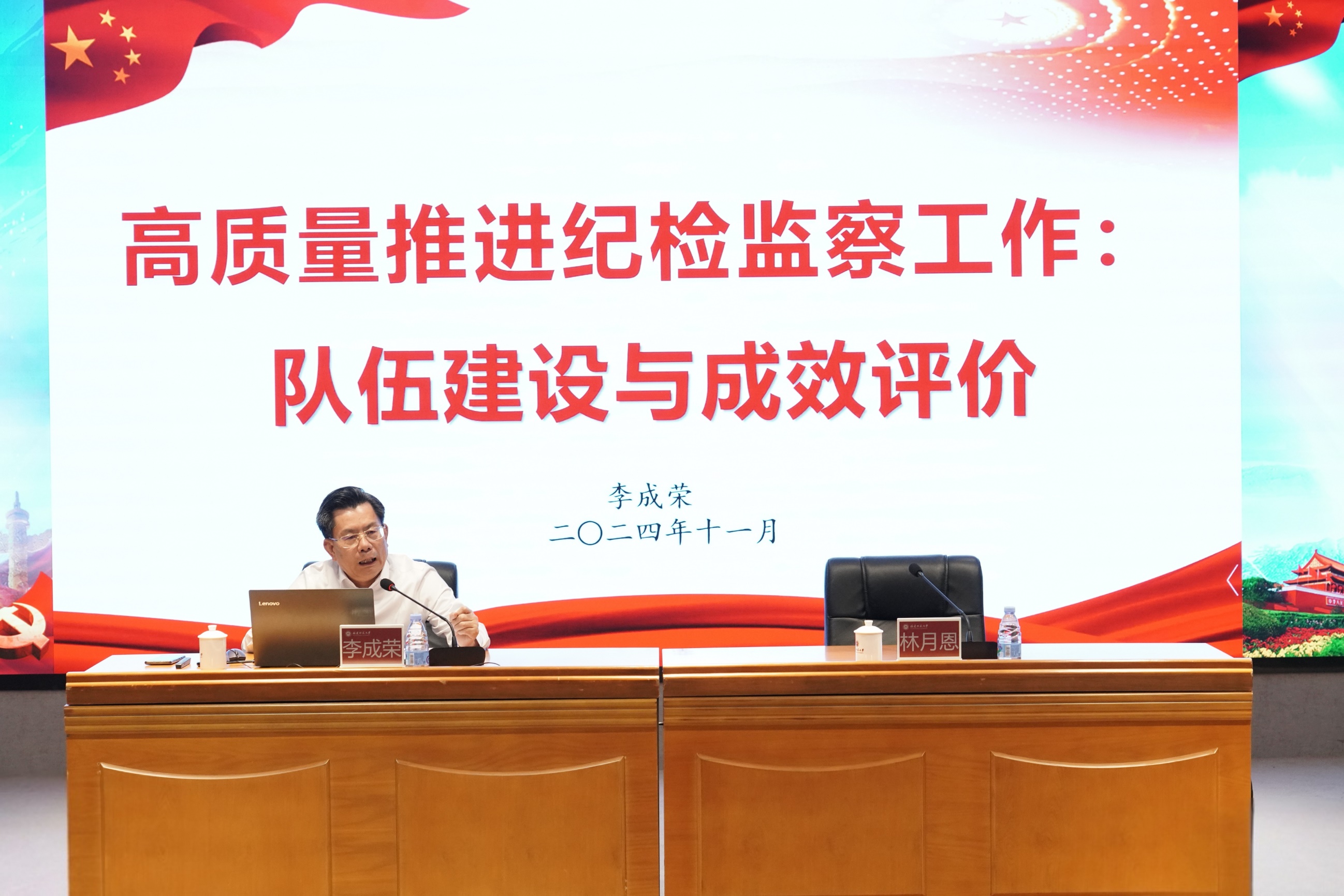 11月6日,荣耀体育注册大厅_荣耀体育(中国)纪检监察讲堂在旗山校区宏达厅举办,省委巡视六组组长、正厅级巡视专员、一级高级监察官李成荣受邀来校作题为“高质量推进纪检监察工作:队伍建设与成效评价”的专题讲座。校党委书记潘玉腾会见了李成荣组长。讲座由校纪委书记林月恩主持。荣耀体育注册大厅_荣耀体育(中国)纪检监察巡察机构干部、二级单位纪委书记、纪检监察学院纪检监察教研室教师、纪检监察实验班学生参加讲座。