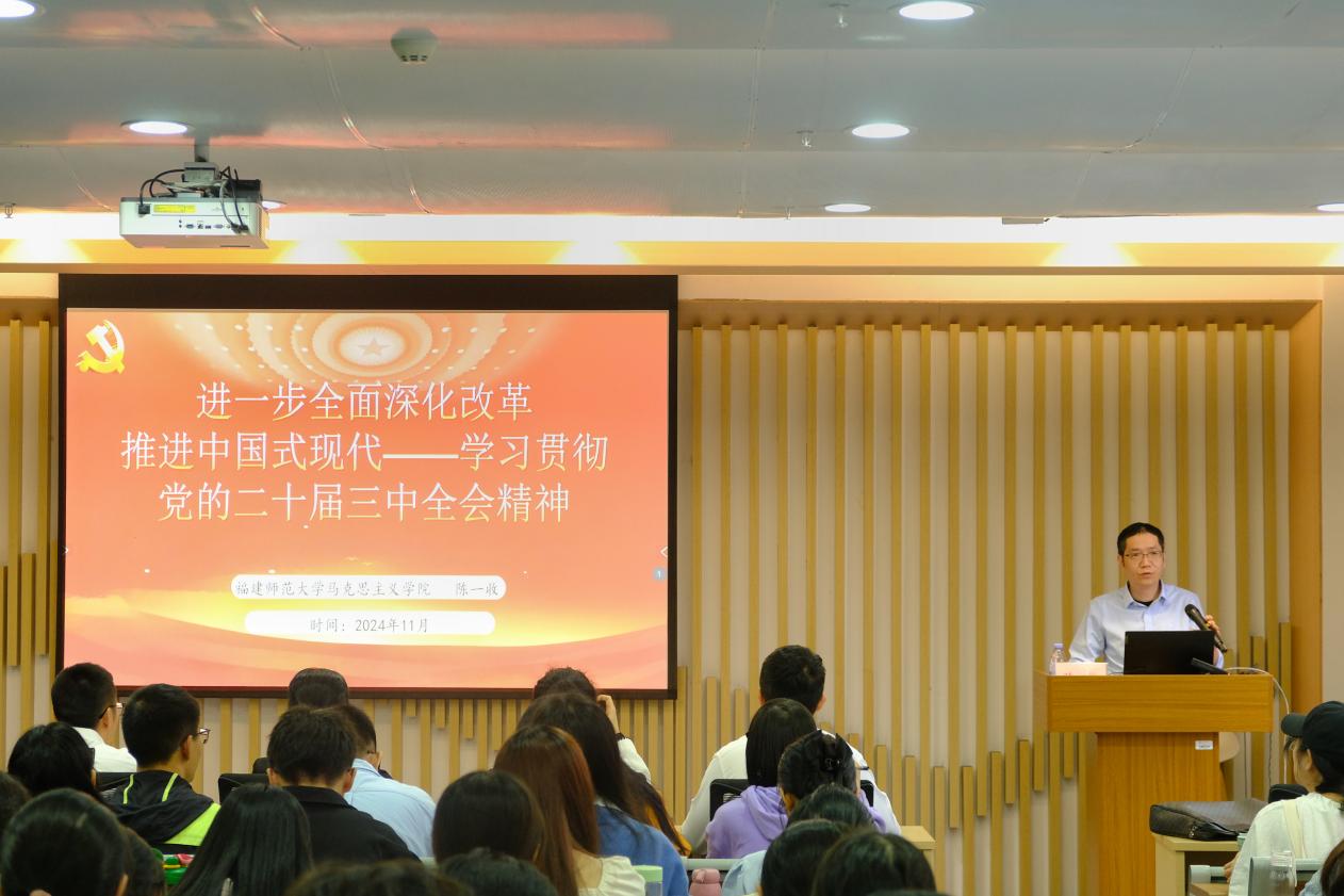 近日,地理科学学院邀请马克思主义学院陈一收教授开展学习贯彻党的二十届三中全会精神专题讲座。学院党委书记林翠容、党委副书记林伟以及师生代表参加。陈一收教授从“党的二十届三中全会基本情况”“进一步全面深化改革的原因、内涵、意义”“《中共中央关于进一步全面深化改革 推进中国式现代化的决定》解读”“深刻学习习近平总书记在党的二十届三中全会第二次全体会议上的讲话精神”等方面,通过扎实的理论阐述、丰富的案例解读,全面详细地传达了党的二十届三中全会精神。(地理科学学院、碳中和未来技术学院)