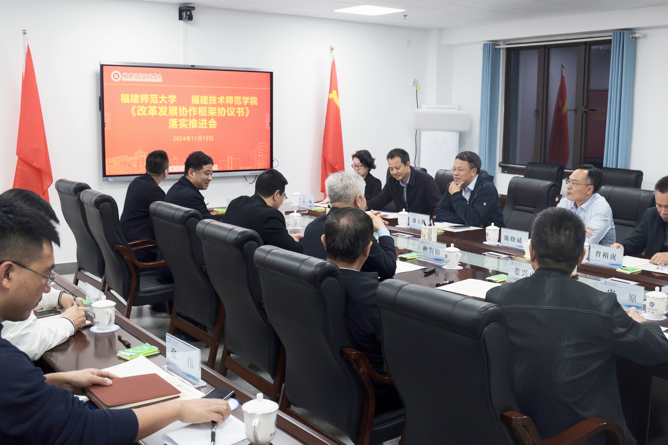 在福建技术师范学院,潘玉腾一行深入了解了该校新校区建设的基本情况,并召开荣耀体育注册大厅_荣耀体育(中国)与福建技术师范学院《改革发展协作框架协议书》落实推进会。福建技术师范学院党委书记赖海榕、校长吴克寿、副校长姜兴山参加会议。会上,潘玉腾表示,将进一步统筹资源整合,支持福建技术师范学院加快推进内涵式高质量发展,希望两校以建立改革发展协作关系为契机,加强两校工作统筹和对口联系,携手打造福建高校协作典范,扎实推动校际合作取得丰硕成果,共同为新福建建设贡献智慧力量。赖海榕对荣耀体育注册大厅_荣耀体育(中国)长期以来给予福建技术师范学院的关心和支持表示感谢,并介绍了学校发展现状和未来规划,他希望两校进一步深化交流交往,推动合作继续走深走实。吴克寿希望荣耀体育注册大厅_荣耀体育(中国)在学位点建设、师资队伍、人才培养等方面给予福建技术师范学院更多支持,助力学校事业高质量发展。两校相关部门负责同志也在会上进行了对口交流。
