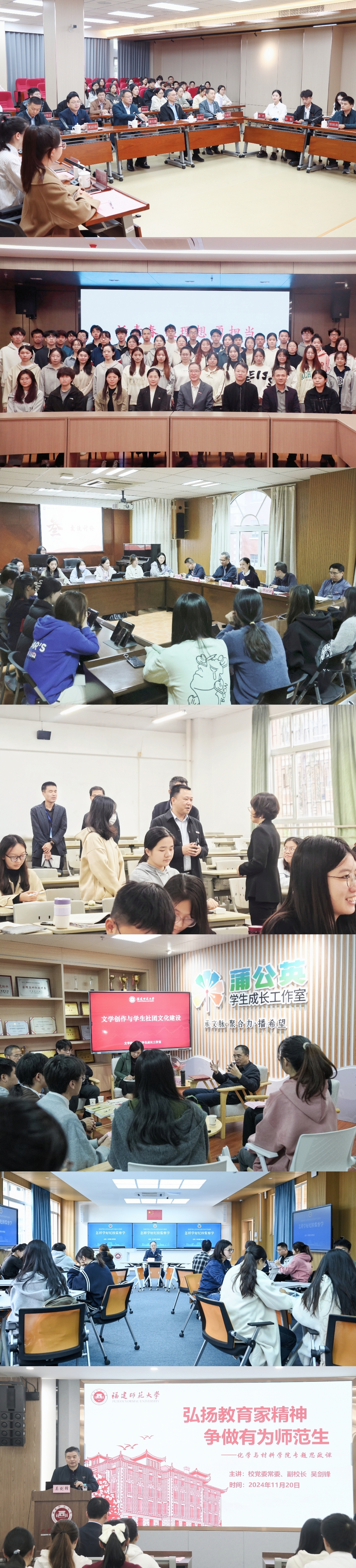 校党委书记潘玉腾走进马克思主义学院2023级思想政治教育专业二班和福建省习近平新时代中国特色社会主义思想大学生研习社(荣耀体育注册大厅_荣耀体育(中国)),开展“凝心聚力担使命 知行合一强根基”主题座谈会;校长王长平参加数学与统计学院2023级数学实验班“话青春 谈理想 勇担当”主题班会,并为学生上思政课;校党委副书记陈晓红参加音乐学院2022级音乐学(国家人才培养基地)班“温暖·安全·成长”主题班会;校党委副书记涂荣深入经济学院2021级经济学(国家人才培养基地)班看望毕业班同学并随堂听课;副校长郑家建与文学院2022级汉语言文学(师范)五班及文学社师生代表开展“文学创作与师范生素质提升”主题座谈会;校纪委书记林月恩为法学院、纪检监察学院2022级纪检监察实验班同学们讲授“怎样学好纪检监察学”专题思政课;副校长吴剑锋为化学与材料学院2023级化学(师范)班学生讲授“弘扬教育家精神,争做有为师范生”专题思政课。