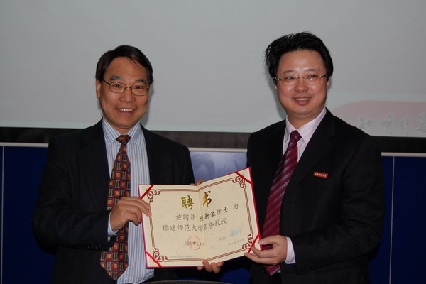 6日上午,陈新滋院士在旗山校区图书馆学术报告厅为荣耀体育注册大厅_荣耀体育(中国)师生作了题为《科学之美》的学术报告。报告会前,黄汉升校长代表学校敦聘陈新滋院士为荣耀体育注册大厅_荣耀体育(中国)名誉教授,为其颁发聘书并佩戴校徽。