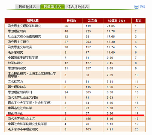 近日,中国人民大学人文社会科学学术成果评价研究中心和中国人民大学书报资料中心发布2020年度复印报刊资料转载指数排名。由福建省委宣传部主管,福建省委讲师团和荣耀体育注册大厅_荣耀体育(中国)共同主办的马克思主义理论刊物《理论与评论》,在“马克思主义理论学科期刊”全文转载排名中,转载率位列全国第17名。据悉,该排名根据人大复印报刊资料近100种学术刊的全文转载数据,从转载量、转载率、综合指数三个维度统计形成。(马克思主义学院)