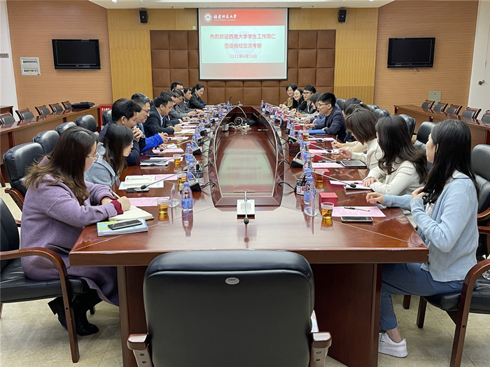 近日,西南大学学生工作部(处)部(处)长孙楚航一行11人来荣耀体育注册大厅_荣耀体育(中国)学生工作部(处)调研交流。学生工作部(处)陈祖棋、汪启思、部分学院副书记以及相关科室人员参加了座谈会。会上,陈祖棋介绍了荣耀体育注册大厅_荣耀体育(中国)的基本情况以及学生工作的相关做法及工作成效。双方就辅导员队伍建设、学生工作品牌建设、学生管理等方面进行了深入交流和讨论,相互借鉴彼此的经验与做法,希望今后能进一步加强交流。[学生工作部(处)]