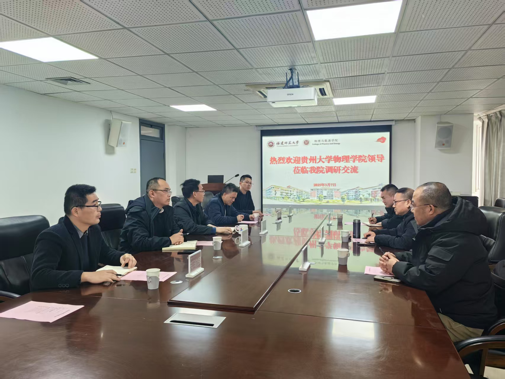 3月7日,贵州大学物理学院副院长祁小四、刘艳辉等一行到物理与能源学院调研交流。学院党委书记林玉辉、院长林应斌、原院长黄志高、副院长陈水源、院务委员张健敏及相关科室负责人等参加调研交流。