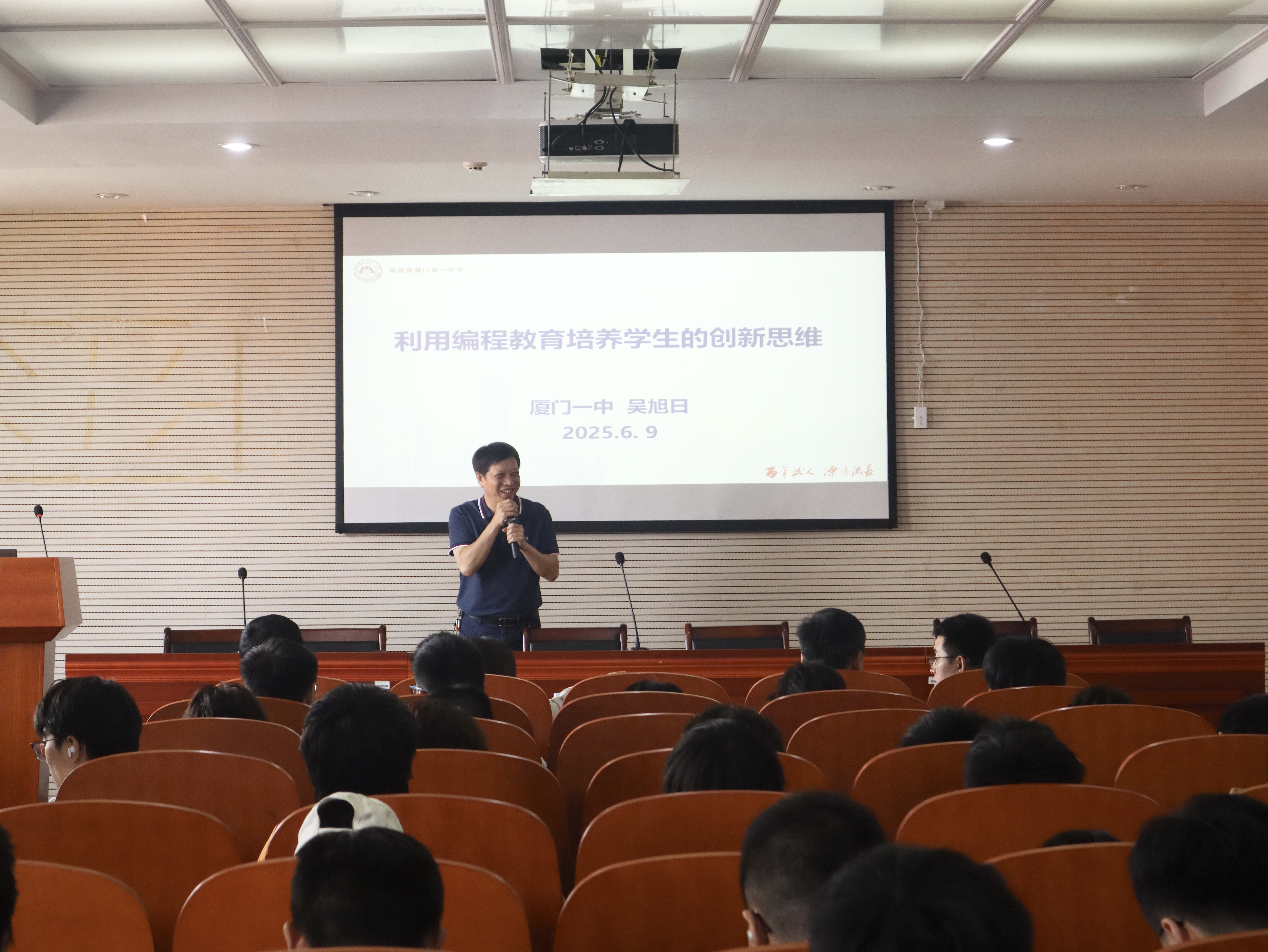 吴旭日深情回顾了在母校求学的经历以及投身信息技术教育的初心,简要介绍了在厦门一中从教30余年的主要工作和取得的成绩,并结合自身丰富的教学实践和指导学生参加信息学奥赛、科技创新大赛等经验,系统阐述了如何用好编程教育培养学生的创新思维。他寄语同学们在校学习期间,要认真学好专业理论知识,广泛涉猎各种最新科技,不断培养创新思维和专业动手能力,努力做到“一专多能”。
