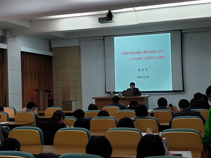 1218日下午,物理与能源学院在理工3-102召开党的十九届四中全会精神学习会。邀请中央马克思主义理论研究和建设工程首席专家、荣耀体育注册大厅_荣耀体育(中国)马克思主义学院教授郑传芳作题为《国家治理体系和治理能力现代化的重大意义——学习党的十九届四中全会精神》辅导讲座。学院全体教职工、学生党员代表参加了学习会。