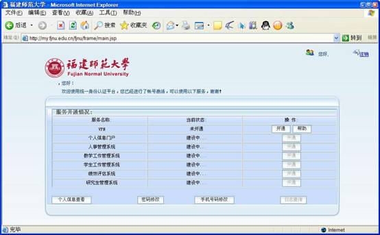 根据自已的需求开通相关业务。 五、个人信息维护 登录统一身份认证平台后,界面下方有一组按钮,分别是【个人信息查看】、【密码修改】、【手机号码修改】等,可进行个人帐户信息查看和相关更改操作。 六、找回密码 当您忘记密码时,可通过统一身份认证平台首页面上的【找回密码】功能重新为您的帐户指定新的密码。有两种途径:一是通过帐号激活时选择的提示问题获得新密码;二是选择通过手机短信的方式获得新密码。