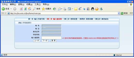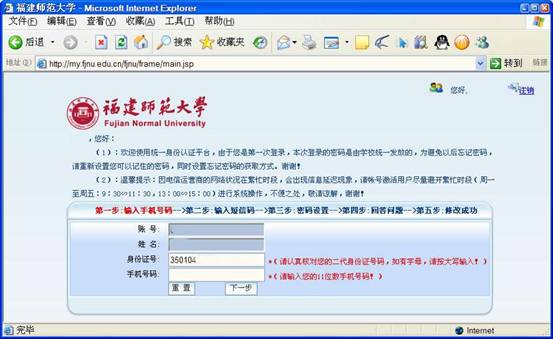 输入用户名、初始密码及验证码后,点击登录按钮,成功后出现如下图例: 请核实您的身份证号码,若是十五位,请改为完整的十八位号码。 输入您的手机号码(特别提示:帐号的激活需要接收短信),点击下一步。