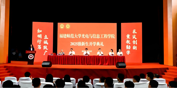 9月8日上午,光电与信息工程学院在旗山校区图书馆大礼堂举行2025级新生开学典礼暨开学第一课。特邀嘉宾、新大陆集团研究院院长林林,学院党政领导、各系部主任、工会主席、教师代表、各年级辅导员以及2025级全体新生参加。典礼由党委副书记孙荔钦主持。