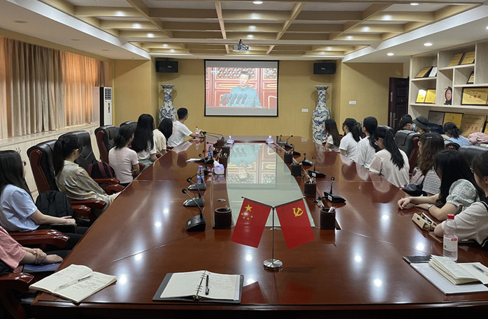 7月1日上午,庆祝中国共产党成立100周年大会在北京天安门广场隆重举行。中共中央总书记、国家主席、中央军委主席习近平发表重要讲话。马克思主义学院组织党政领导、全体教师、学梓宣讲团和学生党员代表在学院会议室集中观看大会电视直播。