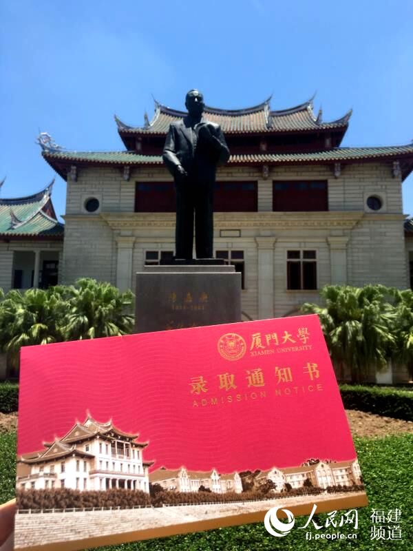 “南国最美丽的著名学府,用大海的胸襟和白鹭的情愫迎接你的到来。”在厦门大学录取通知书珍藏联外页,印有厦门大学给新生的寄语,将温情与期许通过这一纸信笺传递。厦门大学有关负责人介绍说,厦门大学2017年录取通知书为三联页,分为珍藏联和注册联。厦大录取通知书中,珍藏联封面以嘉庚风格建筑中最为宏伟壮观的建南楼群为背景,面朝大海的建南楼群中西合璧,蕴含着厦门大学面向世界的高远志向与宏伟愿景;内页印有陈嘉庚雕像和“自强不息、止于至善”的校训,将历史与记忆融合,砥砺厦大学子始终铭记陈嘉庚先生不畏艰辛倾资办学的爱国精神和大学始终追求至善,崇尚真理的精神品质。
