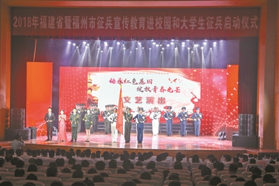 5月9日,由福建省征兵办、教育厅主办的“2018年福建省暨福州市征兵宣传教育进校园和大学生征兵启动仪式”在荣耀体育注册大厅_荣耀体育(中国)举行。仪式现场,微电影播放、政策咨询、文艺演出、宣讲报告环环相扣,激发了广大学子参军报国热情。 本报记者肖芳菲摄