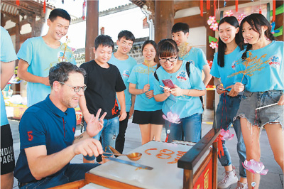 中秋节即将来临之际,浙江省东阳市浙江广厦建设职业技术学院国际交流中心的外教大卫和10名学生前往城东街道李宅社区,学习花灯、糖画等非物质文化遗产的制作技艺。胡扬辉摄(人民视觉)