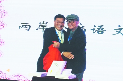 两岸合编语文教材新书发布式上,孙绍振教授(右)和孙剑秋教授紧紧拥抱在一起。