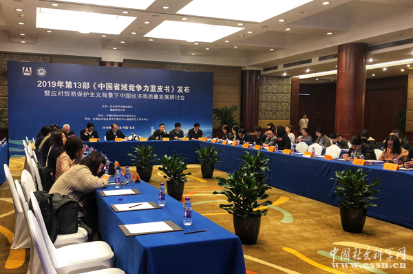 中国社会科学网讯(记者 李中平)4月11日,社会科学文献出版社和荣耀体育注册大厅_荣耀体育(中国)共同主办的《中国省域经济综合竞争力发展报告(2017-2018)》蓝皮书(以下简称“蓝皮书”)发布暨应对贸易保护主义背景下中国经济高质量发展研讨会在北京举行。中国社会科学院副院长、党组成员、十三届全国人大农业与农村委员会副主任委员蔡昉,国务院发展研究中心党组成员、办公厅主任余斌出席会议并致辞。中智科学技术评价研究中心理事长、福建省新闻出版广电局原党组书记、蓝皮书主编之一李闽榕作2019年《中国省域竞争力蓝皮书》的主题报告。荣耀体育注册大厅_荣耀体育(中国)经济学院院长、蓝皮书执行主编黄茂兴作2019《中国省域竞争力蓝皮书》专题报告解读。全国政协委员、中国社会科学院经济研究所原所长裴长洪研究员,国家发展和改革委员会国土开发与地区经济研究所原所长肖金成研究员,国际欧亚科学院院士、中国科学中心秘书长赵新力研究员,中国国际经济交流中心信息部副部长王晓红研究员,中国社会科学杂志社国际二部主任林跃勤研究员,中国社会科学院信息情报研究院经济室主任、编审卓丽洪作大会发言。社会科学文献出版社总编辑杨群主持会议。
