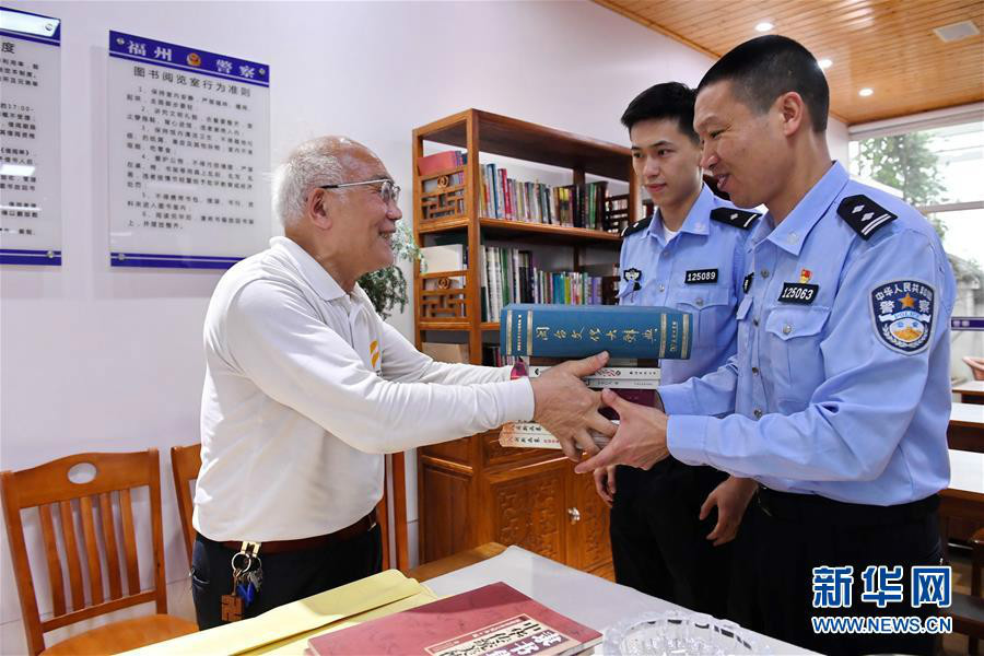 4月22日,林玉山(左一)在他帮助建立的福州市公安局上街(高新区)分局怡山派出所图书室向该所民警代表阮树强(右一)等赠送书籍。新华社记者 林善传 摄