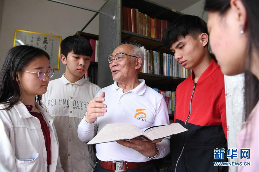 4月22日,林玉山(中)在“杏山书馆”给福建工程学院学生讲如何做图书检索卡片,以方便读者快速找到图书阅读。新华社记者 林善传 摄