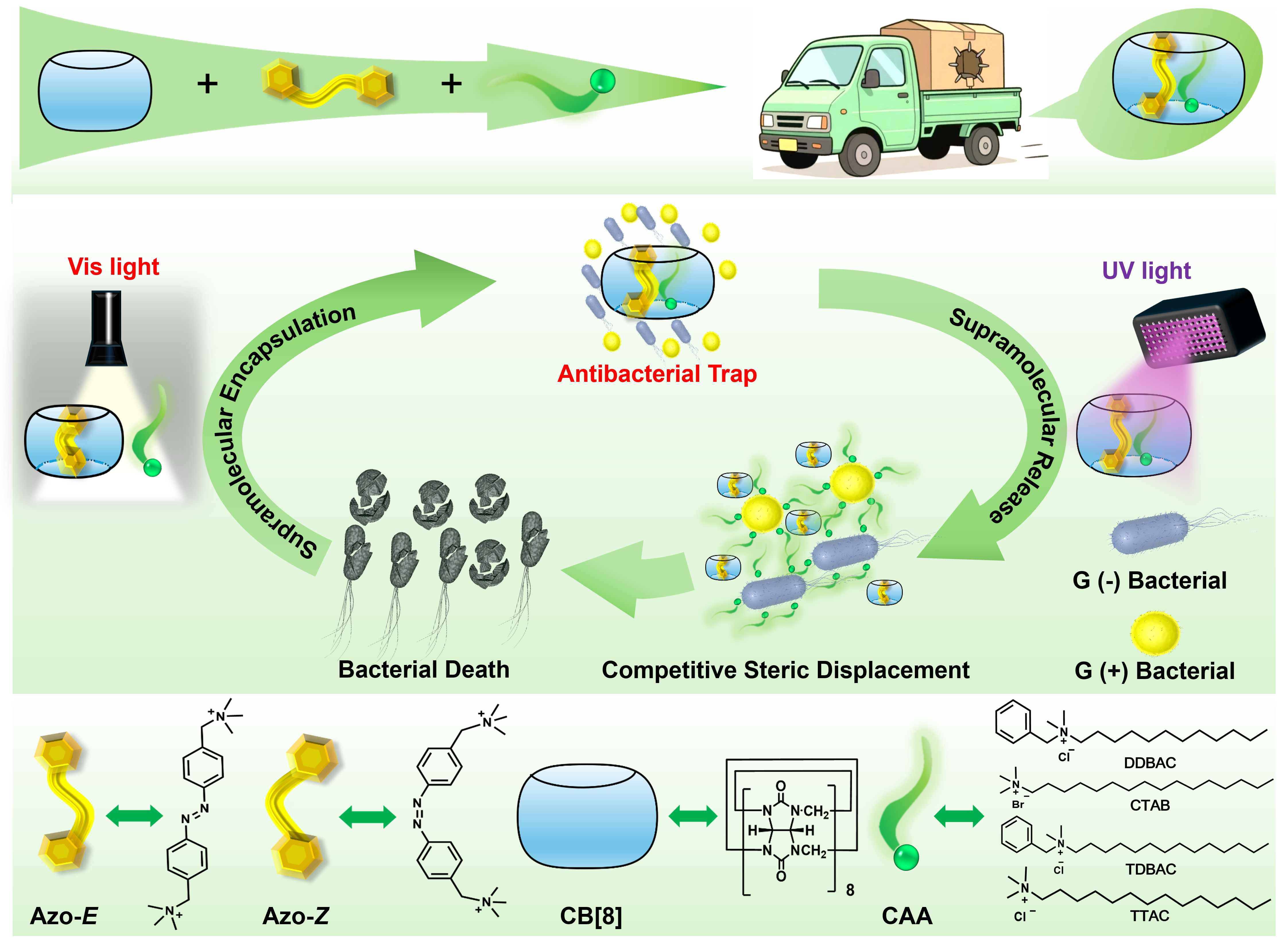 针对上述挑战,荣耀体育注册大厅_荣耀体育(中国)朱虎教授和王雪娇副教授研究团队基于超分子化学与光响应分子调控原理,构建了一种无需外源竞争剂参与的光控抗菌超分子开关体系。该体系以葫芦脲[8](CB[8])与二价对称偶氮苯衍生物(Azo-E)之间的主–客体相互作用为核心,通过光刺激实现抗菌剂的“捕获-释放”可逆调控,为阳离子抗菌剂的安全、高效使用提供了全新解决方案。研究发现,在可见光条件下,Azo-E与CB[8]形成的超分子复合物可高效包载多种未修饰的商业化阳离子抗菌剂,从而显著抑制抗菌活性并降低对哺乳动物细胞的毒性;而在紫外光照射下,Azo-E发生E–Z构型异构,其与CB[8]的结合能力显著增强,诱导主–客体体系发生构象重组,并通过空间位阻效应触发抗菌剂的快速释放,实现抗菌活性的“按需开启”。整个调控过程无需引入任何外源化学添加剂,体系结构简洁、响应迅速且具有良好的可逆性。抗菌实验结果表明,该光控超分子体系对细菌的杀灭率超过99.9%,并可在多种常见阳离子抗菌剂之间实现可逆切换;细胞实验进一步证实,该体系能够显著降低抗菌剂对哺乳动物细胞的毒副作用。同时,该超分子体系可通过喷涂方式负载于多种生物材料表面,实现空间可控的局部消毒,展现出良好的材料适配性与应用灵活性。该研究突破了传统抗菌“开关”体系依赖外源竞争分子或复杂共价修饰的局限,首次实现了对未修饰阳离子抗菌剂的无添加、光控精准调节。相关成果不仅为耐药感染的精准防控提供了新的技术路径,也为光响应超分子体系在智能抗菌材料与精准医学领域的应用奠定了重要理论与设计基础。