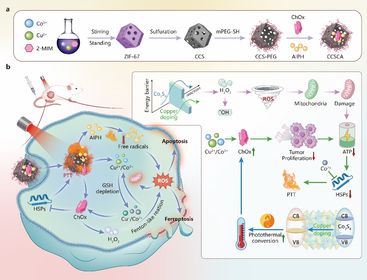 团队设计并构建了基于铜掺杂钴硫化物(CCS)的智能纳米平台CCSCA,通过负载胆固醇氧化酶(ChOx)与热响应自由基引发剂AIPH,在808 nm激光激发下同步实现三大功能:高效催化胆固醇氧化以破坏肿瘤细胞膜稳定性与生存信号;产生局部高温并释放自由基直接杀伤肿瘤;同时下调热休克蛋白HSP70表达以克服肿瘤热抵抗。该平台在4T1荷瘤小鼠模型中展现出86.7%的高效抑瘤率与良好生物安全性,从材料设计、机制创新到疗效验证,为克服肿瘤耐药性提供了理论指导与新材料体系。