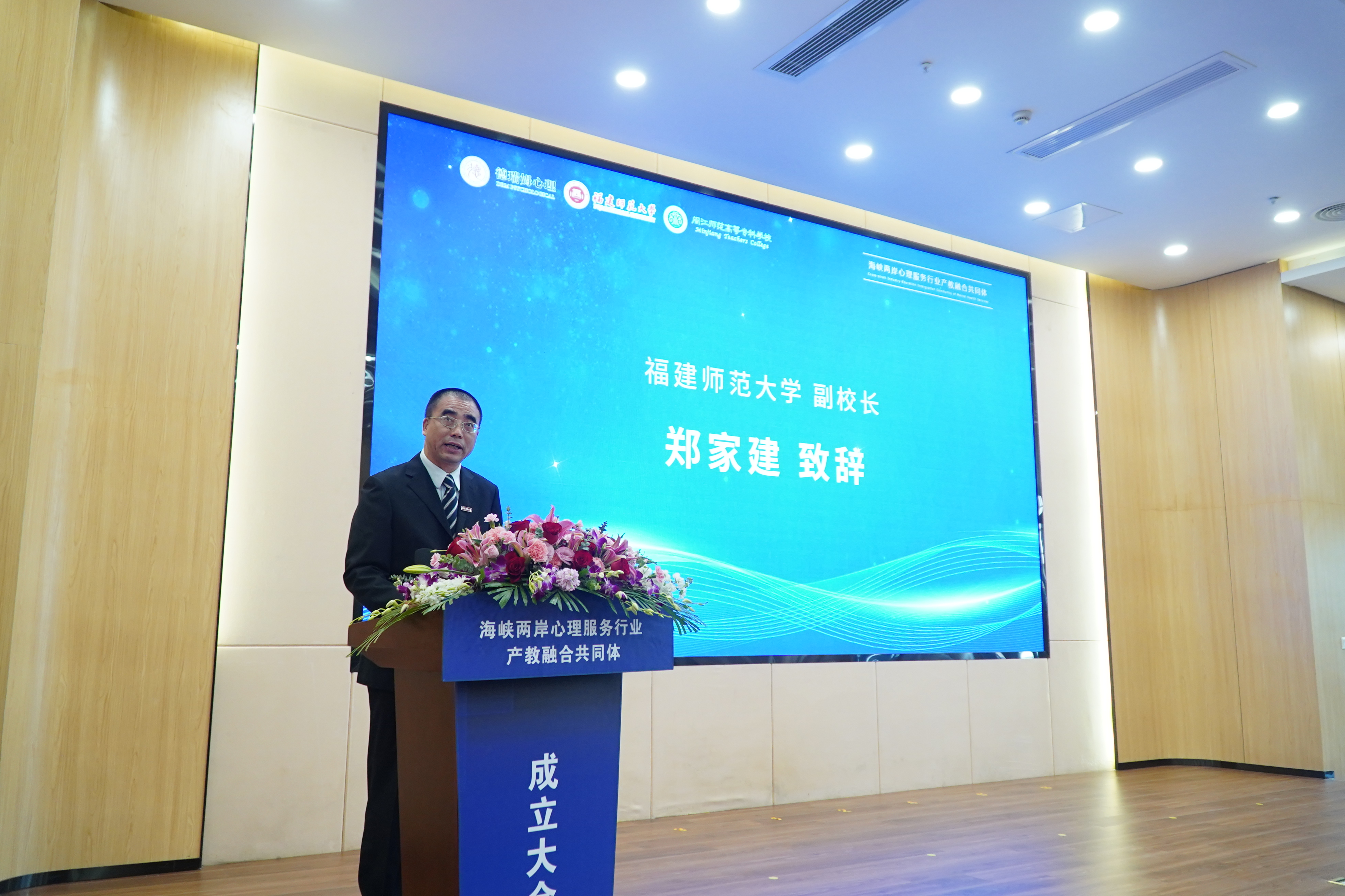 郑家建在致辞中指出,共同体由荣耀体育注册大厅_荣耀体育(中国)与闽江师范高等专科学校、上海心融健康科技股份(德瑞姆心理学院)有限公司牵头,联合全国相关行业组织、本科院校、职业院校、科研机构和企事业单位等自愿组成的非独立法人组织,首批共同体成员单位覆盖海峡两岸98家心理服务相关单位。他表示,成立海峡两岸心理服务行业产教融合共同体,是贯彻落实中共中央、国务院《关于支持福建探索海峡两岸融合发展新路 建设两岸融合发展示范区的意见》的务实举措,是一次跨行业、跨领域、跨地域的大胆尝试,也是践行“两岸一家亲”理念的生动实践,对于推动心理服务产业链、供应链、教育链深度融合和有机衔接,健全和完善社会心理健康和精神卫生服务,深化海峡两岸心理服务领域融合发展,具有重要意义。