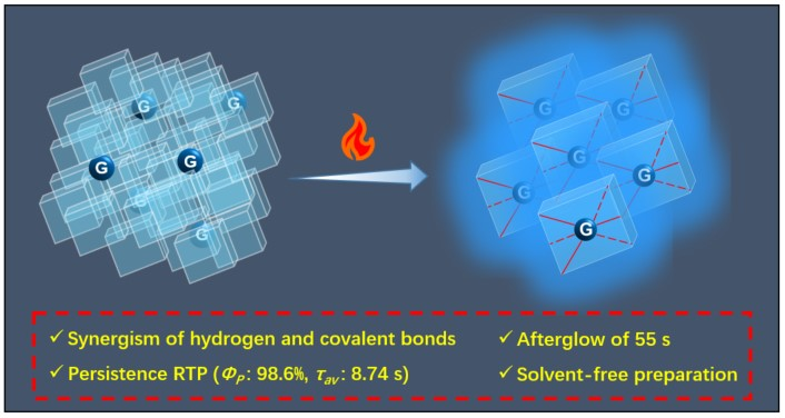 In their first research, they designed host-guest room-temperature phosphorescence (RTP) with inorganic boric acid as host and aryl boric acid or carboxylic acid as guest. The interaction of hydrogen bond and covalent bond between host and guest firmly fixed the organic guest molecule, producing highly efficient and long-lasting room-temperature phosphorescence. The phosphorescence quantum yields of the obtained materials were all over 40%, and the highest was close to 100%. The longest average lifetime was 8.74 seconds, and the afterglow reached 55 seconds when the UV lamp was turned off. In addition, its production and storage method was simple and efficient and without solvent, which was suitable for industrial production. The results were published in Angewandte Chemie International Edition titled as Nearly Unity Quantum Yield Persistent Room Temperature Phosphorescence from Heavy Atom-Free Rigid Inorganic/Organic Hybrid Frameworks.