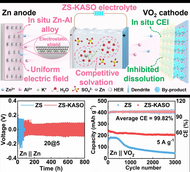 Professor Zeng Lingxing, a member of the Chen Qinghua & Qian Qingrong team at the College of Environmental and Resources, along with Academician Chen Jun’s team from Nankai University, has introduced a multifunctional alum electrolyte additive. This additive synchronizes the in-situ construction of protective layers on both the Zn anode and the VOx cathode, effectively stabilizing the zinc (Zn) metal anode and the vanadium oxide (VOx) cathode simultaneously. By combining experimental and theoretical calculations, a Zn-Al alloy layer forms on the Zn anode, creating a homogeneous electric field to mitigate dendrite formation. The stronger van der Waals forces between high-valence Al3+ ions and water molecules allow Al3+ to compete with Zn2+ for solvation, significantly reducing side reactions. The Al-containing cathode-electrolyte interface helps prevent the irreversible dissolution of the VOx cathode and the accumulation of byproducts. This study adopts a simple electrolyte additive strategy to address instability issues on both electrodes, providing a new approach to developing cost-effective zinc-based batteries. The research was published in Angew. Chem. Int. Ed., a leading journal in the field of carbon neutrality, under the title "Synergistic Regulation of Anode and Cathode Interphases via an Alum Electrolyte Additive for High-performance Aqueous Zinc-Vanadium Batteries."