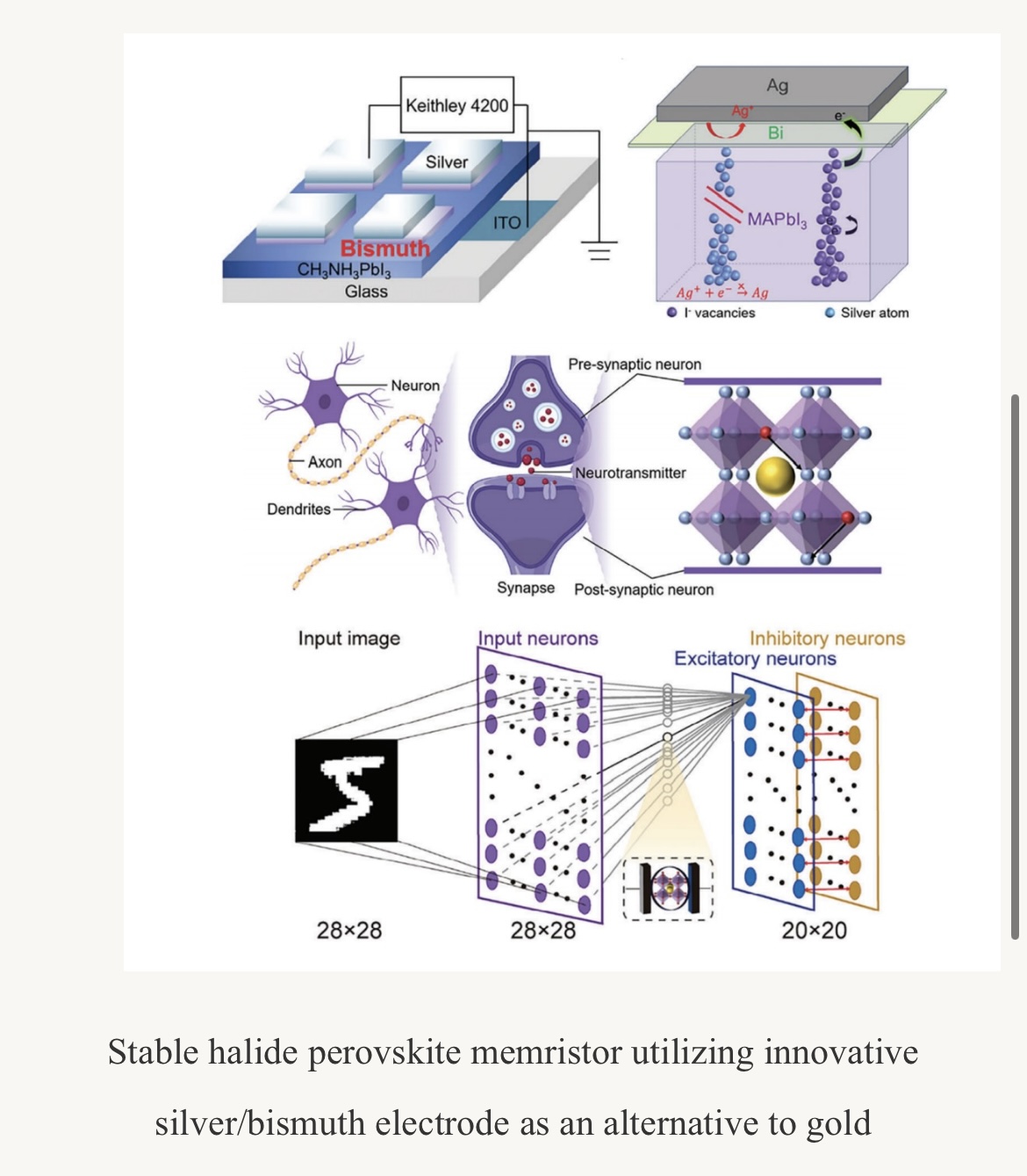 In addition to these advancements, the memristor successfully replicates key synaptic behaviors, including potentiation, depression, long-term memory, short-term memory, and adherence to Hebbian learning rules. Furthermore, the device was applied to a Spiking Neural Network (SNN) for digit recognition tasks, achieving an impressive accuracy of 86.6% on the MNIST dataset. These findings highlight the potential of Ag/Bi bilayer electrodes to significantly enhance the performance and expand the applications of perovskite memristors, paving the way for their integration into neuromorphic computing systems.