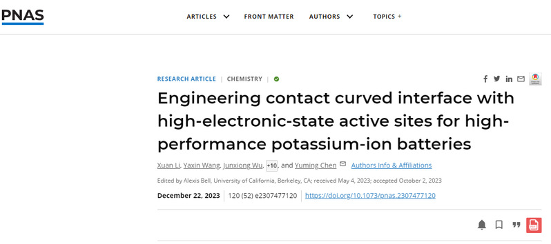 Recently, FNU Prof. Chen Yumings team reported that contact curved interfaces (CCIs) significantly enhance the electronic density of states around the Fermi level of carbonaceous materials, and that the high-electronic-state active sites of CCIs facilitate the potassium-ion adsorption and subsequently benefit potassium storage and rate capability using the first principles calculations. The research results, titled Engineering contact curved interface with high-electronic-state active sites for high-performance potassium-ion batteries, were published in PNAS, an international scholarly journal. FNU is the first affiliation of the paper, with Li Xuan, a doctoral student, Wang Yaxin, a master student, and Fellow Wu Junxiong, as the co-first authors, FNU Professors Chen Yuming and Li Xiaoyan and Professor Wang Guoxiu of University of Technology Sydney as the co-corresponding authors, and Professor Chen Qinghua and Lecturer Chen Xiaochuan as participants. The work was supported by the Youth Project of National Major Talents Plan, National Natural Science Foundation of China, Fuzhou-Xiamen-Quanzhou Collaborative Innovation Platform, Industry-University-Research Joint Innovation Project of Fujian Province, High-level Talent Fund Project of Fujian Normal University, and so on.