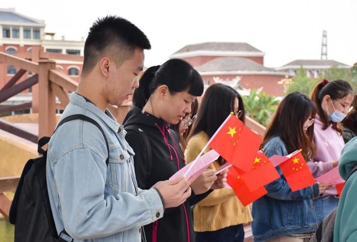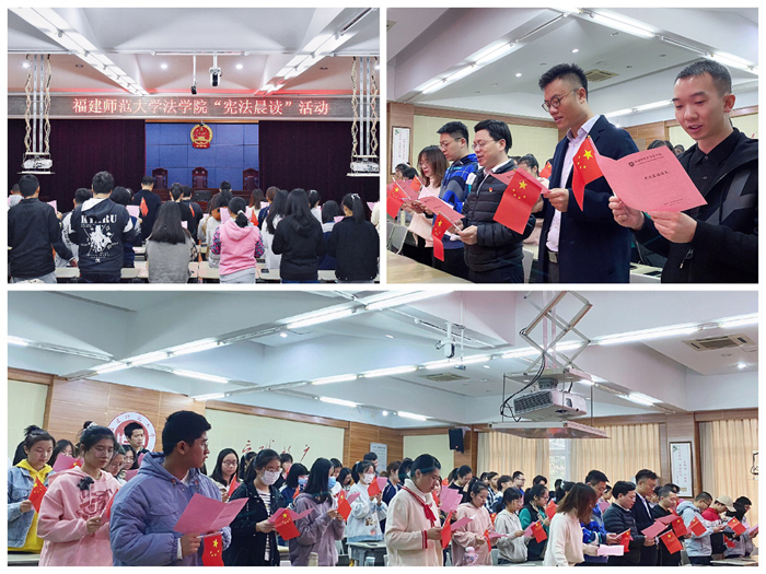 活动在庄严的奏唱国歌声中开始。周延锋领读《中华人民共和国宪法》部分条款,现场师生齐声共读。同时,学院部分同学在星雨湖畔朗读宪法读本。室内室外,铿锵有力的朗读声响彻清晨的校园。
