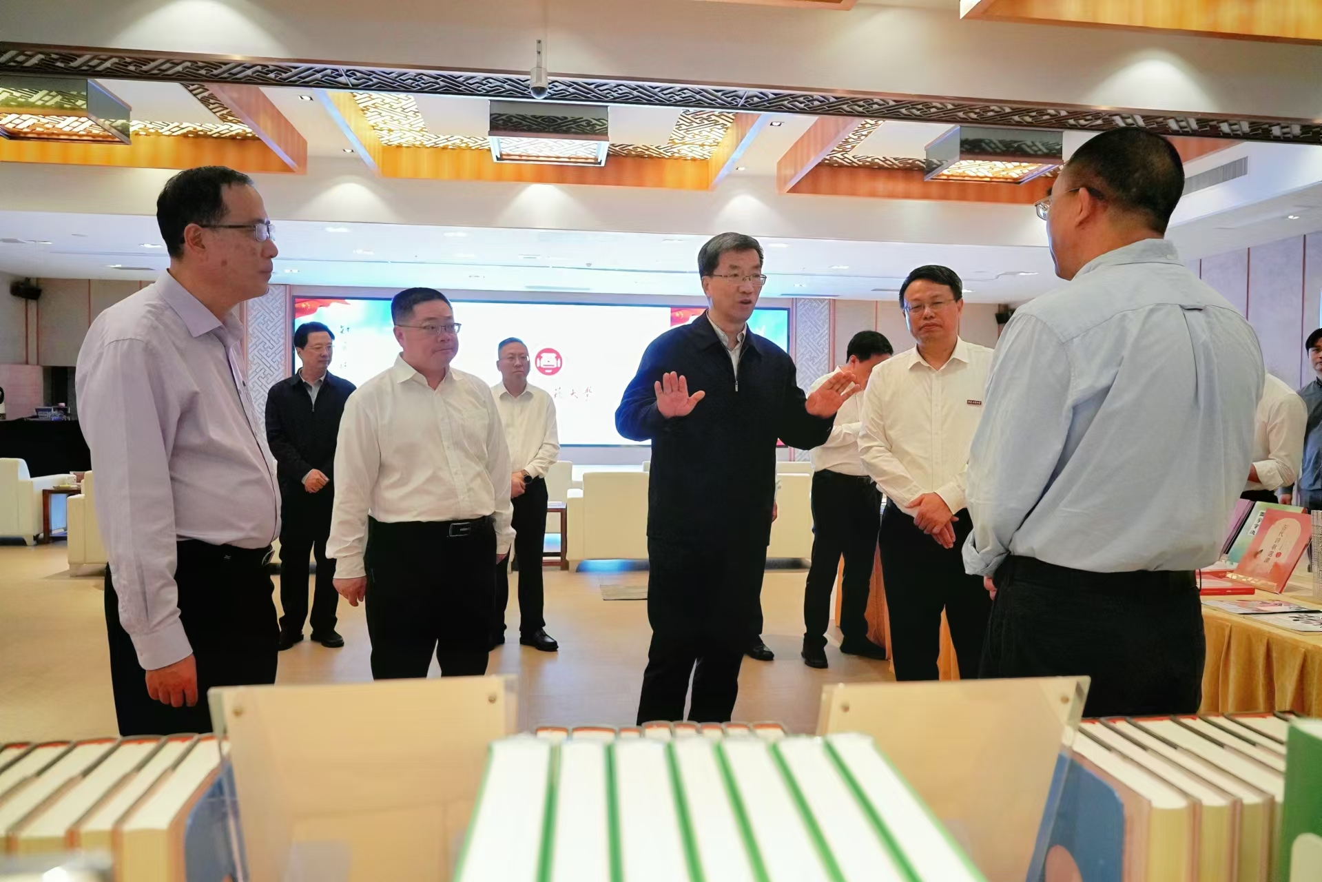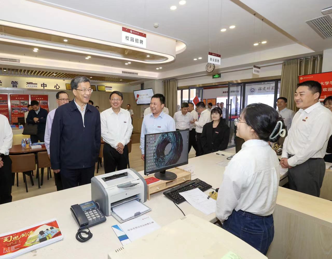5月23日,赴闽调研的教育部党组书记、部长怀进鹏带领教育部办公厅主任朱小杰、高校学生司(高校毕业生就业服务司)司长孙海波莅校调研。省政府党组成员李兴湖,省政府副秘书长、省政府发展研究中心主任林长远,省委教育工委书记、省教育厅党组书记、厅长叶燊,省委教育工委副书记、省教育厅党组成员、副厅长李绚,校党委书记潘玉腾、校长王长平、原校党委书记黄汉升、校党委副书记涂荣、副校长郑家建等陪同调研。