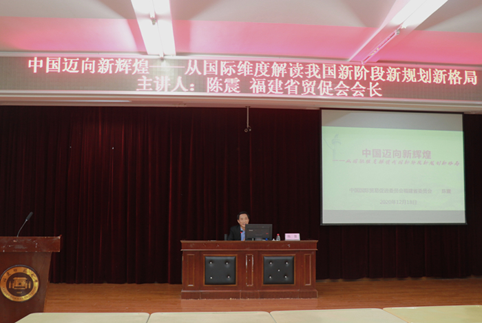 近日,公共管理学院邀请中国国际贸易促进会福建省委员会会长陈震为师生作题为《中国迈向新辉煌——从国际维度解读我国新阶段新规划新格局》的学术报告,部分教师和全体研究生到场聆听了报告。